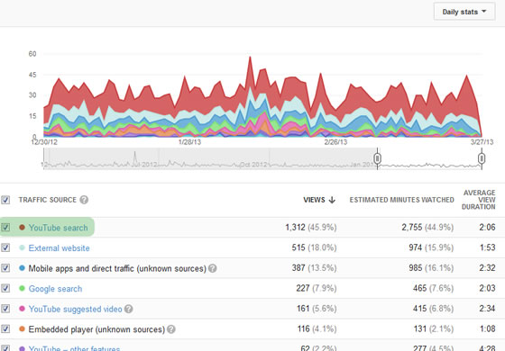 Click on “traffic sources”. This will present you with a graph detailing where most of the views are coming from, and there’s a sliding scale under the graph to let you change the date range. The majority of views will almost certainly be from people searching YouTube, so let’s find out what people are searching for to find your video – click on the link “YouTube search”.